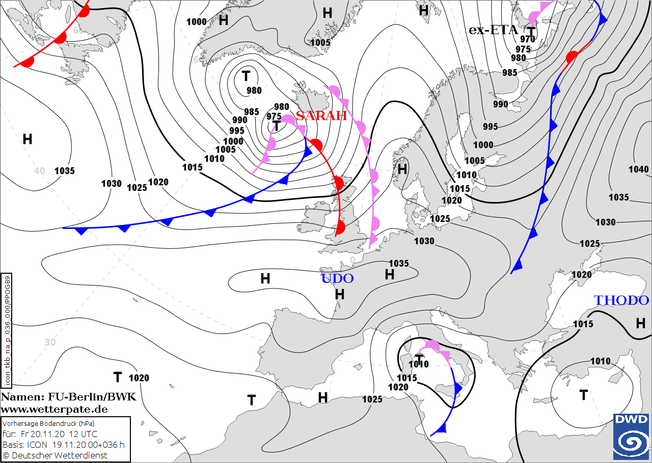 Noms des dépressions et anticyclones prévus pour vendredi 20 novembre 2020 à midi (Berlin)