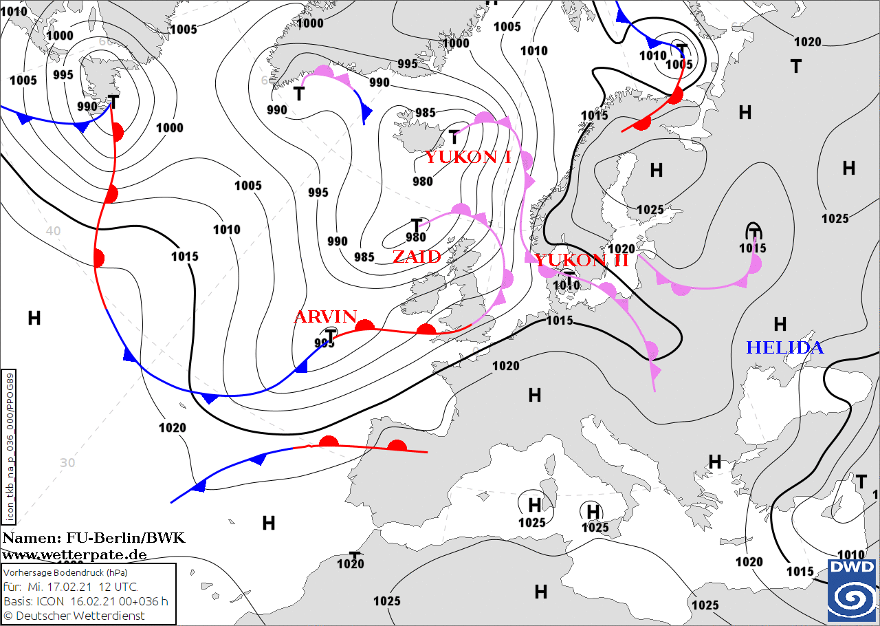 Noms des dépressions et anticyclones prévus pour mercredi 17 février 2021 à midi (Berlin)