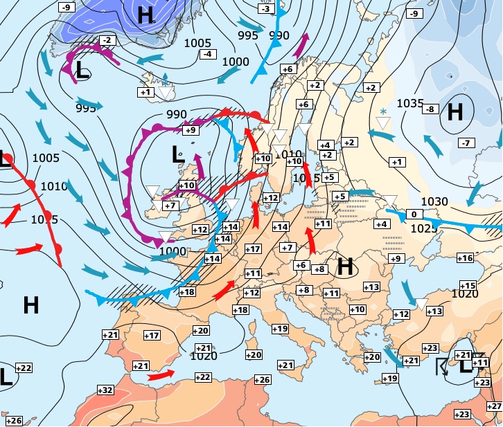 + L’anticyclone continental qui nous protégeait jusqu’à présent a cédé, face a une imposante dépression britannique.