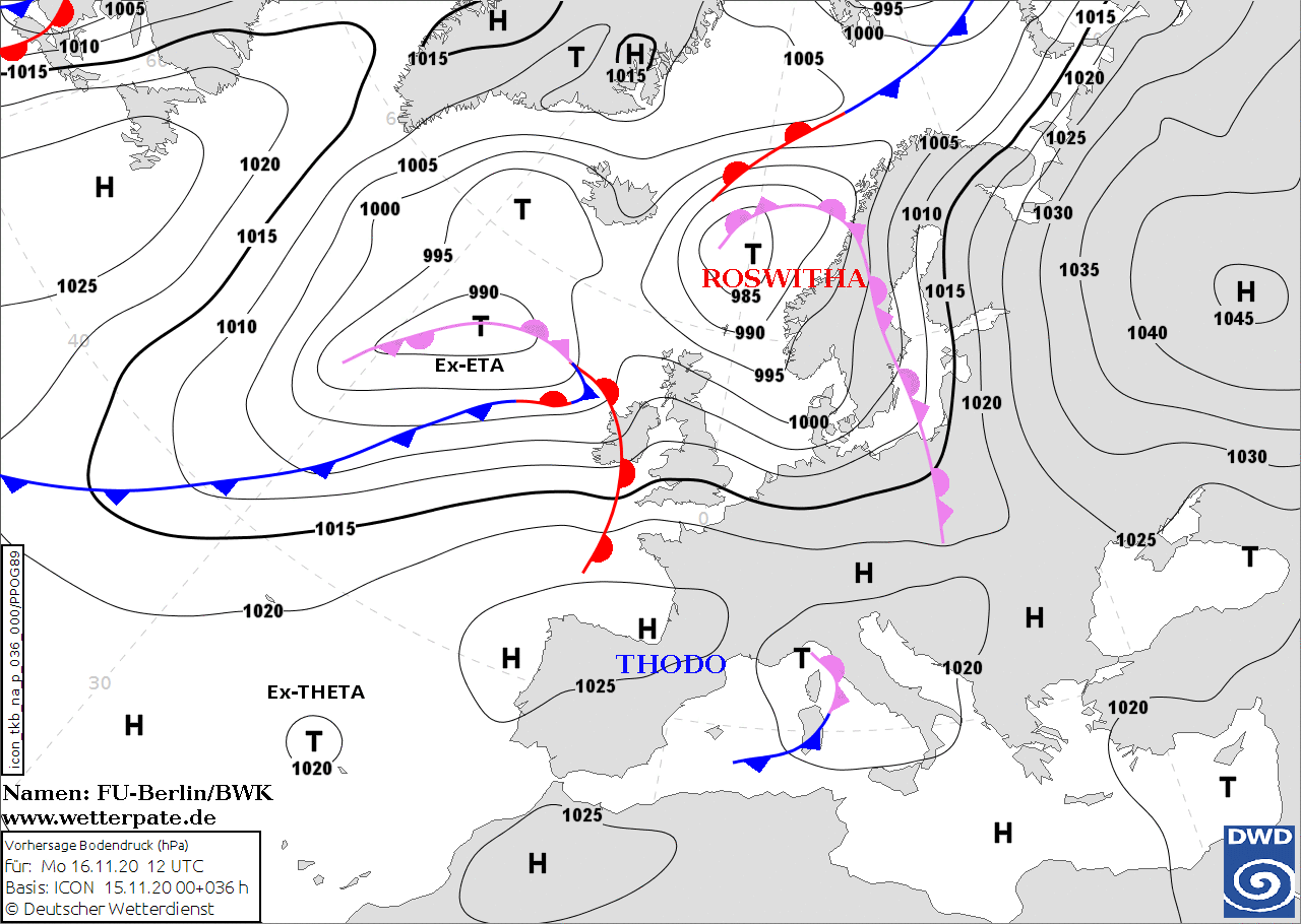 Noms des dépressions et anticyclones prévus pour lundi 16 novembre 2020 à midi (Berlin)