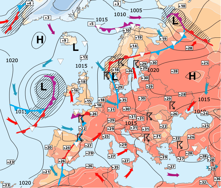 + Ensuite, l’air plus frais venu de l’Atlantique prendra lentement le dessus, mais comme l’air très chaud résistera dans le Sud-est, d’autres orages sont encore possibles en début de semaine prochaine - excepté près de la Méditerranée.