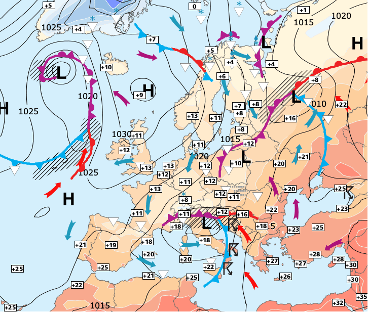 Noms des dépressions et anticyclones prévus pour vendredi 16 octobre 2020 à midi (Berlin)