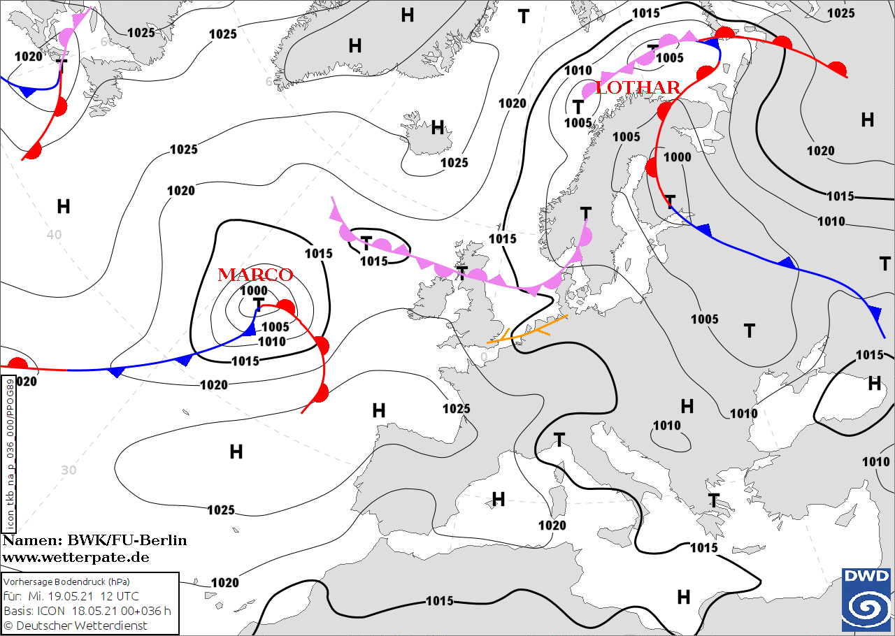 Noms des dépressions et anticyclones prévus pour mercredi 19 mai 2021 à midi (Berlin)