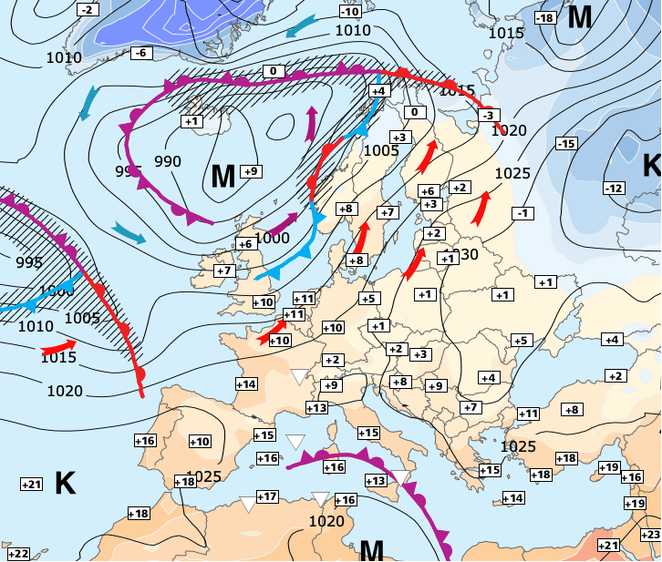 + À partir de dimanche 27 décembre, une vaste zone dépressionnaire accompagnée d’air plus ou moins froid (à préciser) envahira presque toute l’Europe occidentale et occasionnera de fréquentes précipitations (parfois sous forme de neige en montagne).