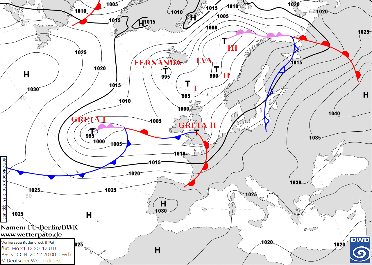 Noms des dépressions et anticyclones prévus pour lundi 21 décembre 2020 à midi (Berlin)