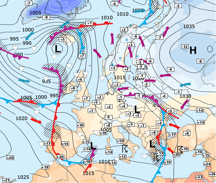 + Changement de régime sur l'Europe occidentale : après plus d’une semaine où nous avons été influencés par une descente froide en provenance de Scandinavie, le courant bascule à l’ouest avec une remontée des températures en allant vers l'Atlantique.
