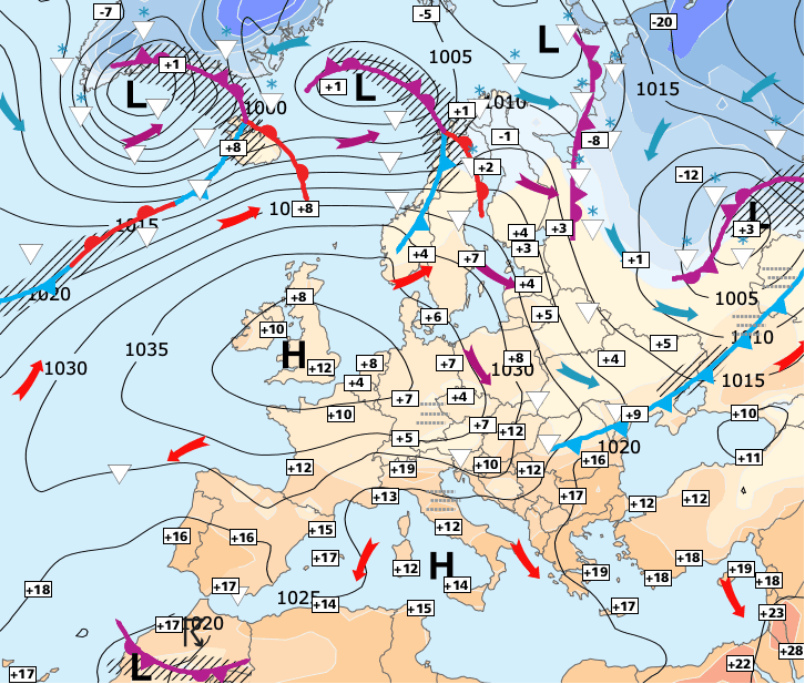 + L'immense anticyclone Jacqueline (centré sur Londres) étend de plus en plus son influence.