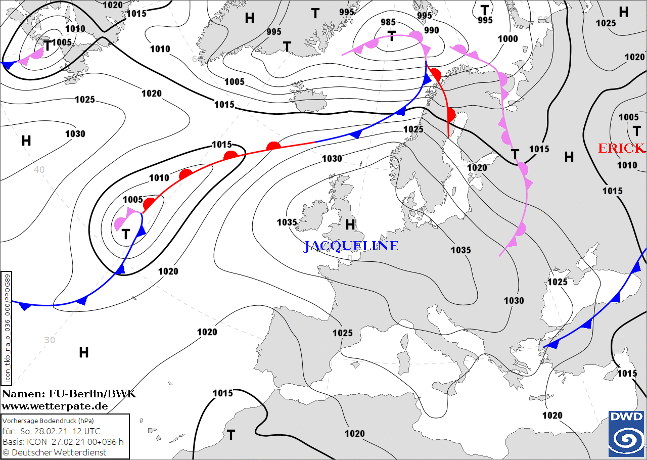 Noms des dépressions et anticyclones prévus pour dimanche 28 février 2021 à midi (Berlin)