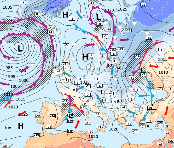 + En début de semaine prochaine, l’air froid commencera à reculer avec l’arrivée de plusieurs perturbations sur la moitié Nord (précédée d’un peu de neige et de verglas dans l’extrême Nord-est durant la journée de lundi).