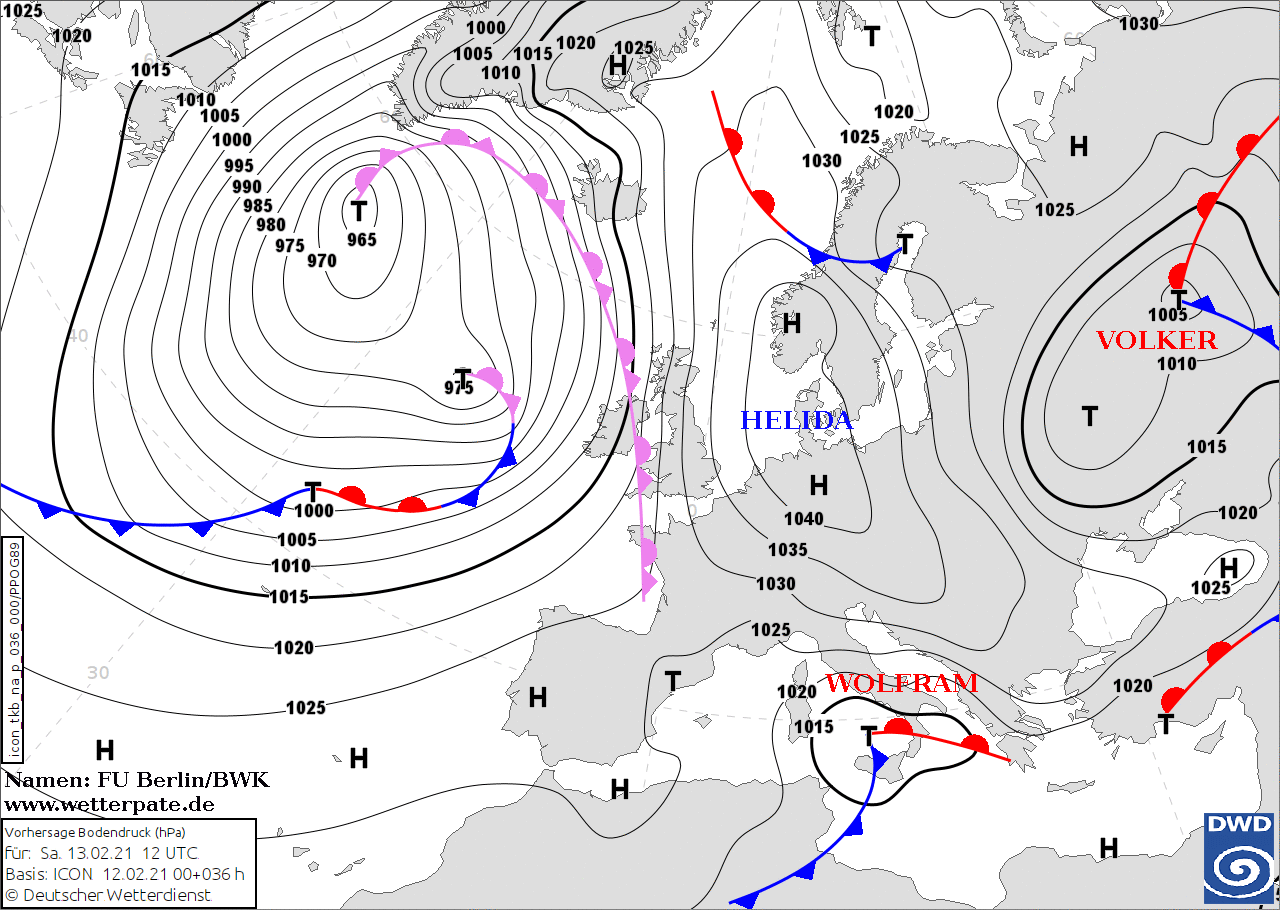 Noms des dépressions et anticyclones prévus pour samedi 13 février 2021 à midi (Berlin)