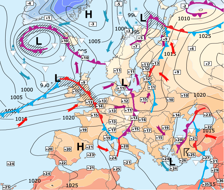 + L’amélioration qui concerne déjà les régions méridionales (soleil et douceur) progressera vers le nord car l'anticyclone subtropical gonfle peu à peu, rejetant le courant perturbé océanique vers les Iles britanniques.
