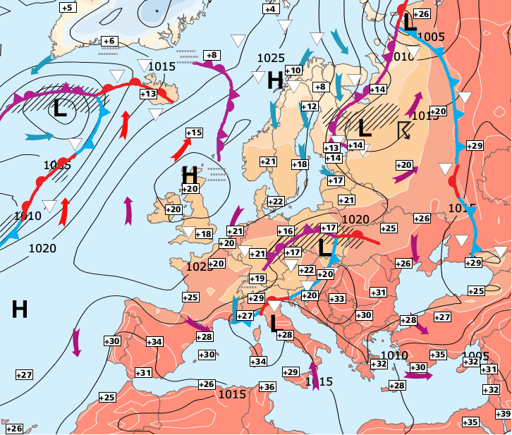 + Cet anticyclone devrait nous accompagner au moins jusqu’au début du mois de septembre,  maintenant un temps sec et stable.