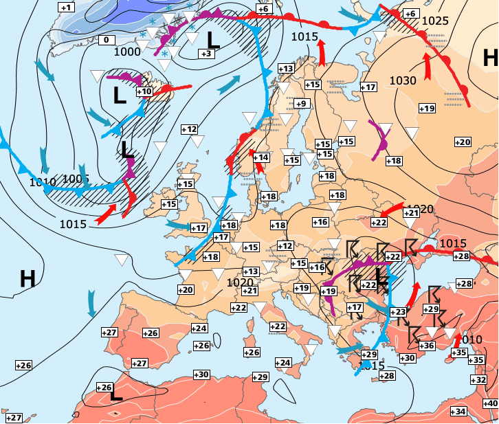 Noms des dépressions et anticyclones prévus pour mercredi 30 septembre 2020 à midi (Berlin)