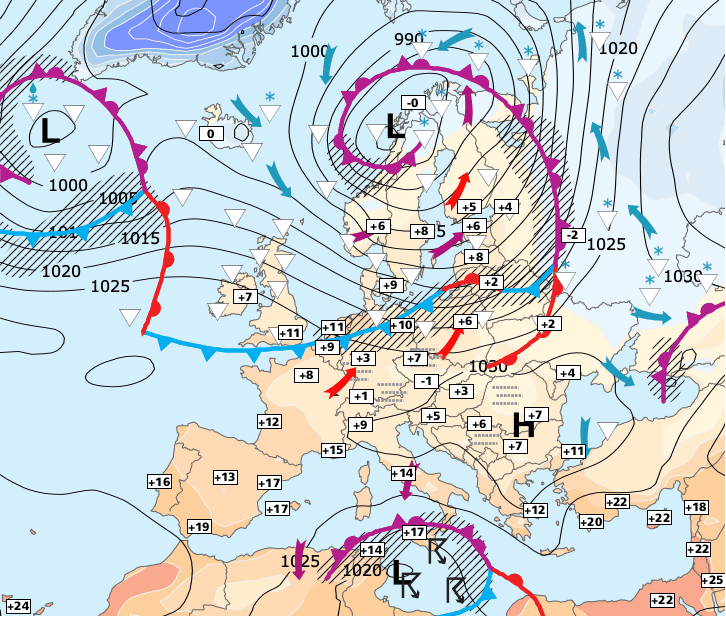 + A partir de mardi, le centre de l'anticyclone se décalera vers l'Est, occasionnant des remontées plus douces en provenance d'Espagne.