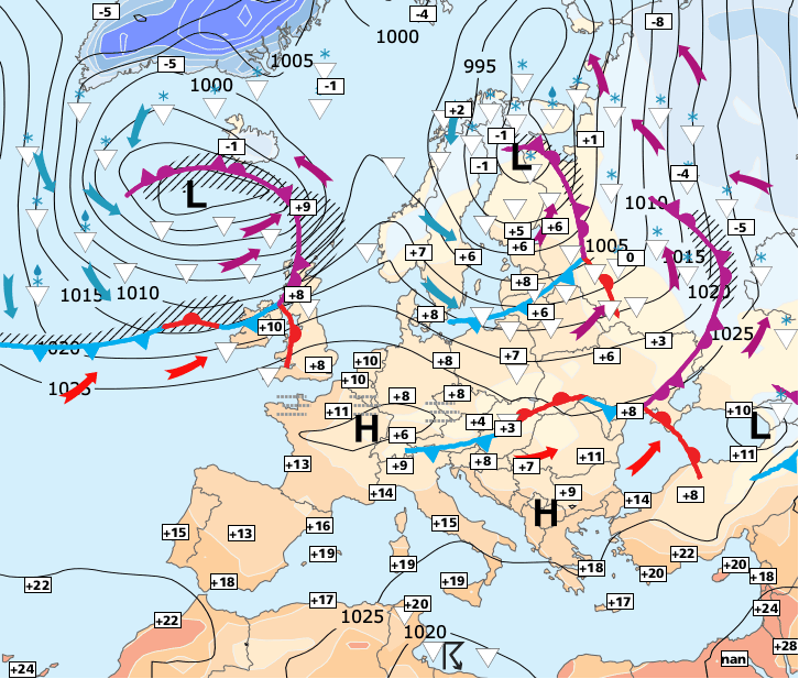 Noms des dépressions et anticyclones prévus pour mardi 24 novembre 2020 à midi (Berlin)