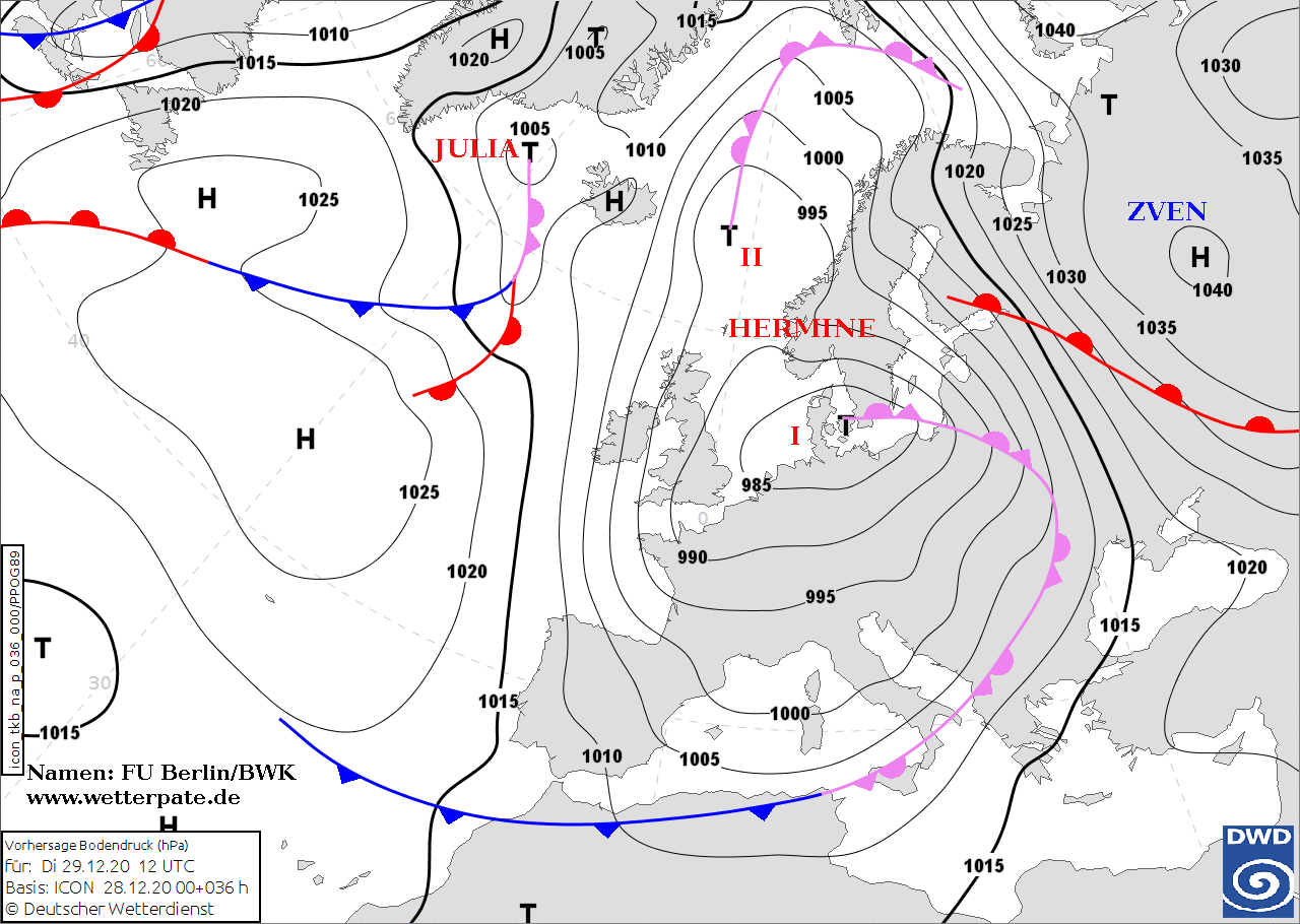 Noms des dépressions et anticyclones prévus pour mardi 29 décembre 2020 à midi (Berlin)