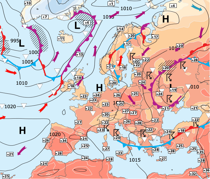 + L’instabilité disparaîtra presque totalement sur les régions de l'Est à partir de ce week-end et la chaleur deviendra assez forte au Sud de la Loire (décalage du centre de l’anticyclone vers les Pays-Bas faisant remonter de l’air sec et plus chaud en provenance d’Afrique du Nord).